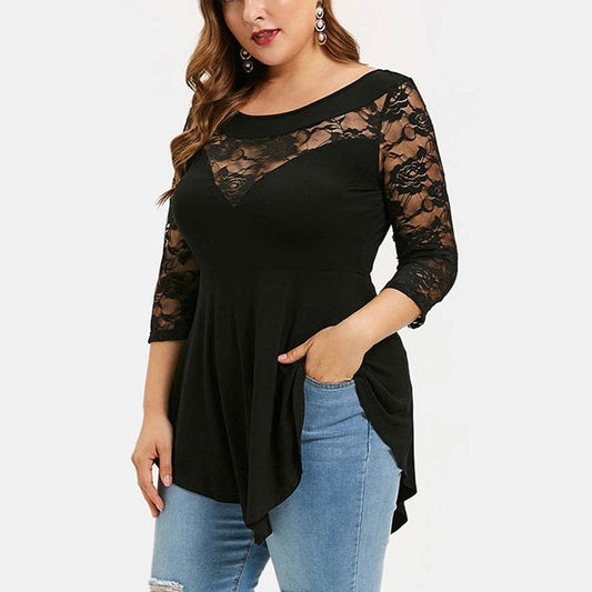 Plus Size Floral Lace Tunic Blouse Shirt for Women - Sexy Hollow Out, Ruffled, Irregular Hem - Spring Autumn Big Size Tops